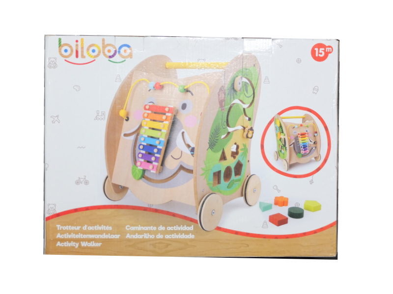 Bébé pourra travailler ses talents de musicien grâce au petit xylophone. Trop mignon, le xylophone représente la trompe d'un éléphant qui se dessine sur l'avant du jouet d'éveil. Bébé pourra également faire tourner des engrenages hauts en couleur et faire rentrer les bonnes formes dans un classeur de formes. Un petit circuit à billes permettra à votre enfant de travailler sa dextérité. Il pourra aussi reconstituer un mini puzzle représentant des animaux en tournant les images. Bébé pourra ranger tous les petits accessoires qui vont avec son chariot en bois dans un petit compartiment qui se trouve à l'arrière du chariot en bois.