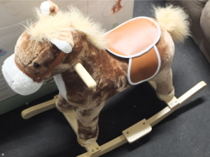 Super cheval à bascule bien solide. Neuf mais ne fait pas de son quand on appuye sur l'oreille.