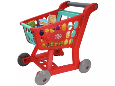 Caddie de course avec 7 boîtes et 12 fruits/légumes/oeufs.